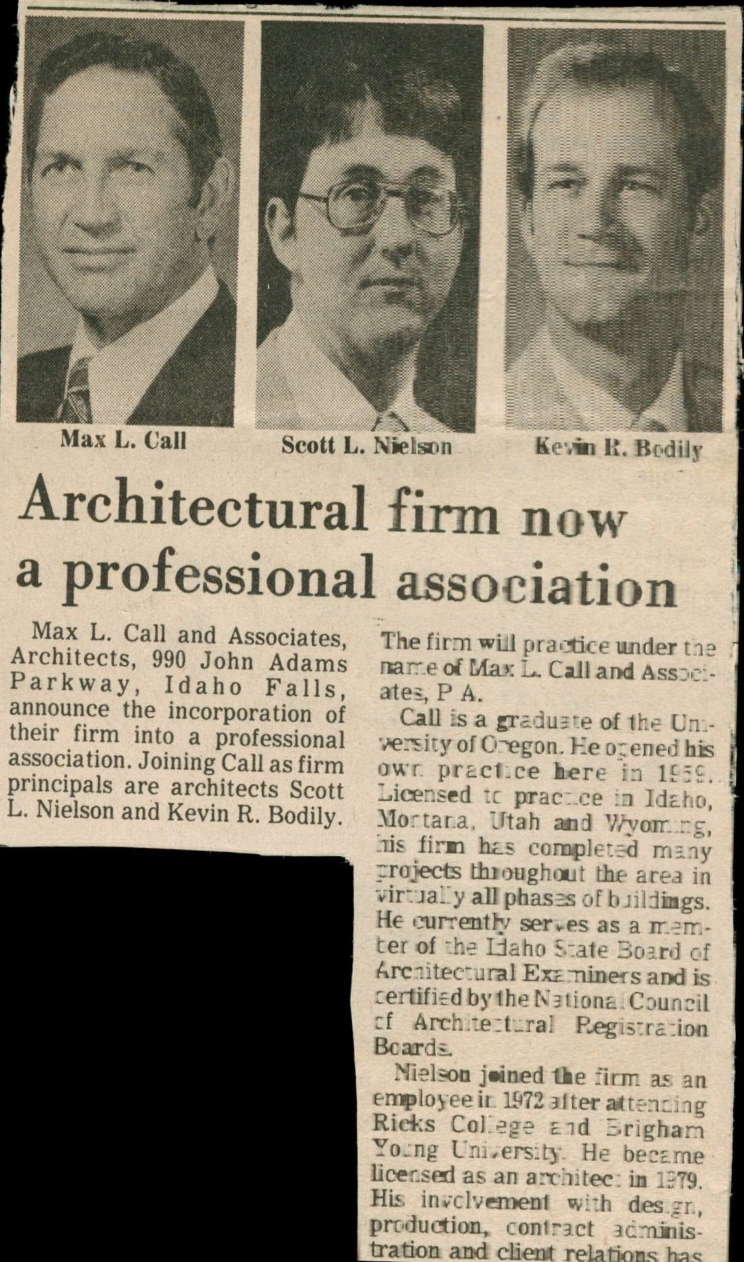In 1980, the firm incorporated with long time associates, architects Scott L Nielson and Kevin R. Bodily, joining Max Call in ownership of the firm.